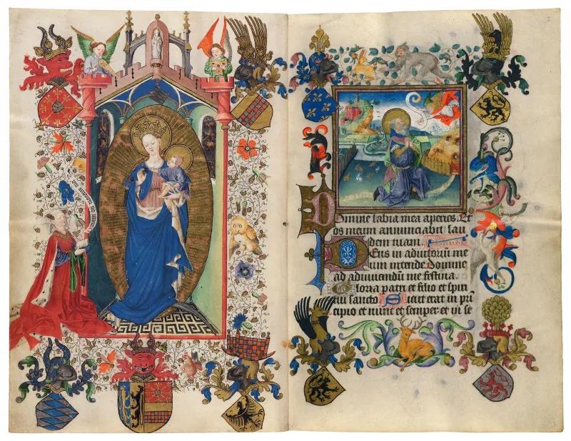Cette double page correspond aux folios 1v et 2r du Livre d'heures de Catherine de Clèves, folios qui représentent respectivement Catherine de Clèves agenouillée aux pieds de la Vierge et du Christ enfant, et l'Annonciation à Joachim. Le manuscrit en deux volumes est conservé à la Morgan Library sous la cote MS M.917/945.